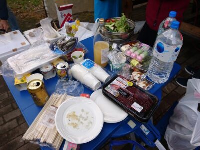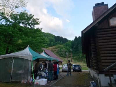 翌朝はあいにくの雨。少し止んだすきに周辺を散歩し、雨に濡れた新緑を楽しみ清々しい朝でした。コテージ内でもモーニングコーヒーをいただきながら、のんびりとした時間。朝食はコテージ内でめった汁と焼肉、サラダ、漬物など美味しくいただきました。今年の味噌汁は例年にない具の取り合わせで、残り野菜が里芋、じゃがいも、さつまいもと芋尽くし!こんにゃくを持ってきてくれたメンバーのおかげで助かりました。なかなか美味しかった!